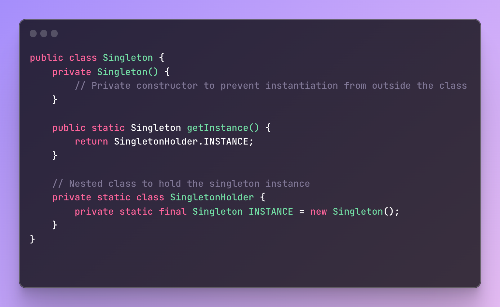 - 중첩 클래스를 사용하면 중첩 클래스의 정적 초기화 덕분에 싱글톤 인스턴스가 느리게 초기화되고 스레드로부터 안전한지 확인할 수 있습니다.