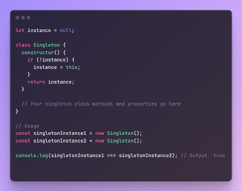 - 이렇게 하면 Singleton 클래스의 인스턴스 하나만 생성되고 새 인스턴스를 생성하기 위한 모든 후속 호출 간에 공유됩니다.