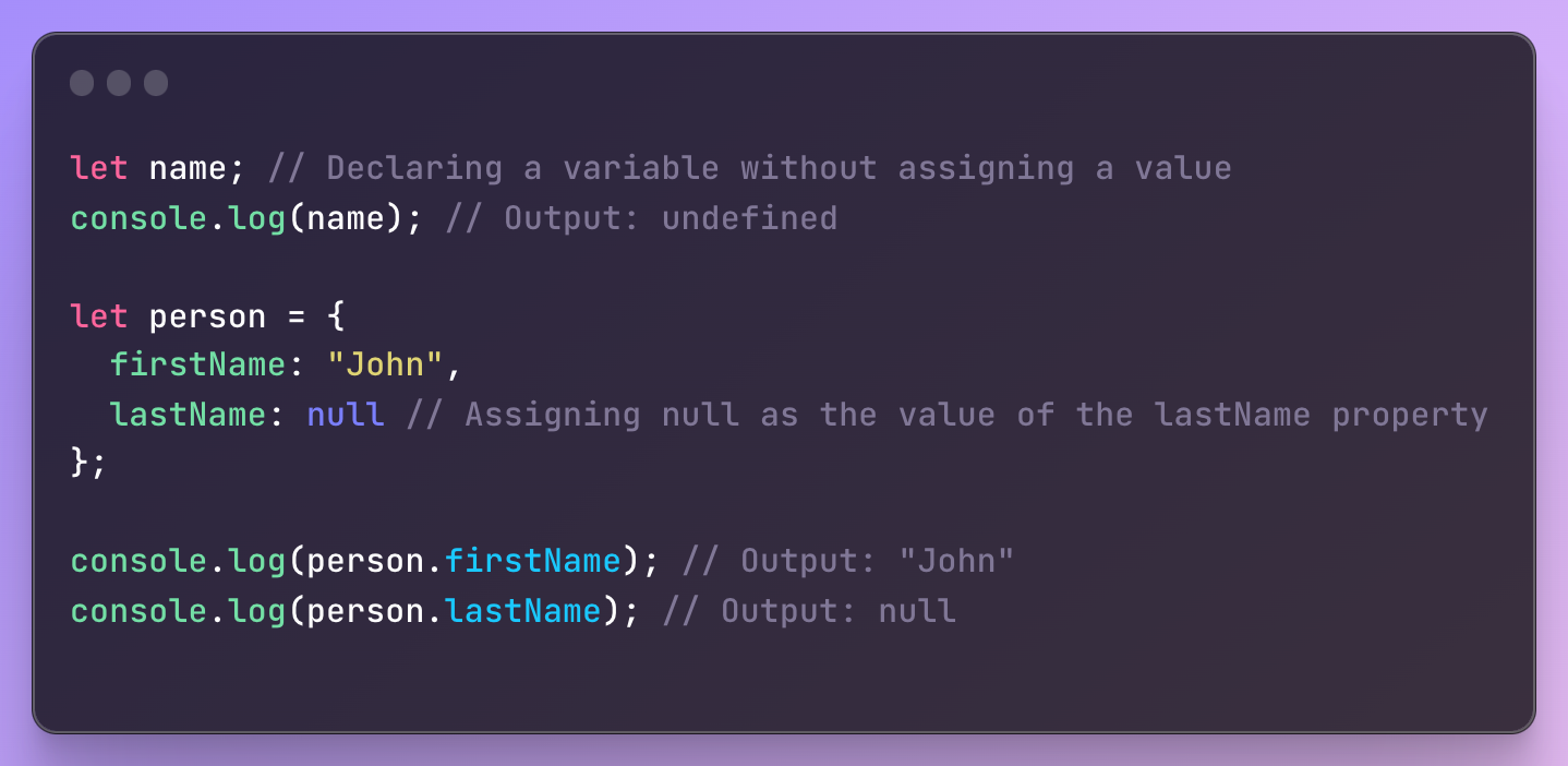 firstName과 lastName이라는 두 가지 속성을 가진 person 객체를 생성합니다. 이 경우 명시적으로 null 값을 lastName 속성에 할당합니다. person.firstName에 액세스하면 예상대로 "John"이 출력됩니다. 그러나 person.lastName에 액세스하면 null이 출력됩니다. 이는 'lastName' 속성에 의도적으로 의미 있는 값이 할당되지 않았음을 나타냅니다.
