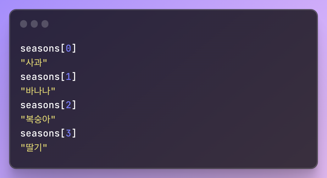 이때 사용한 0, 1, 2, 3을 배열의 인덱스라고 부릅니다. 인덱스는 0부터 시작합니다.