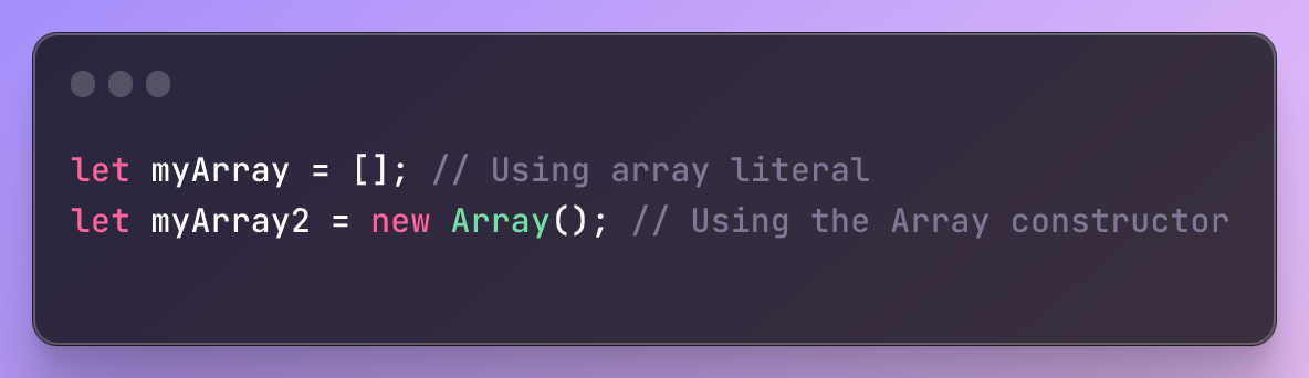 배열은 위 예시처럼 배열 리터럴([]) 또는 Array 생성자를 사용하여 만들 수 있습니다.