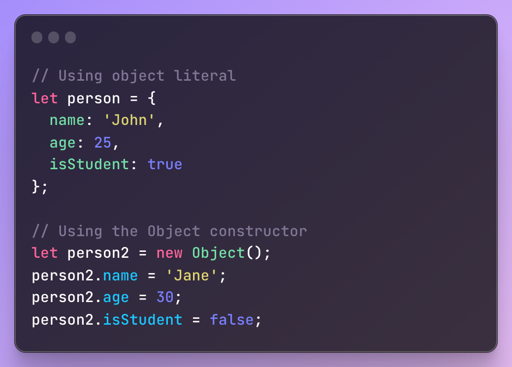 객체는 객체 리터럴({}) 또는 Object 생성자를 사용하여 객체를 생성할 수 있습니다.