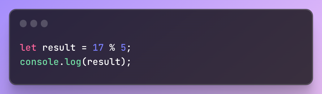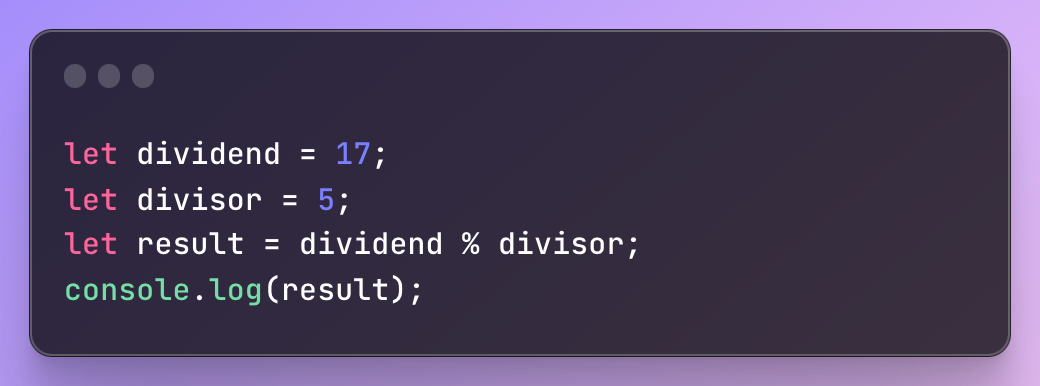 이 예시에서 피제수는 'dividend' 변수에 저장되고, 제수는 변수 'divisor'에 저장되며, 나누기 연산의 나머지는 변수 'result'에 할당됩니다. console.log() 함수는 콘솔에 결과를 표시하는 데 사용됩니다.