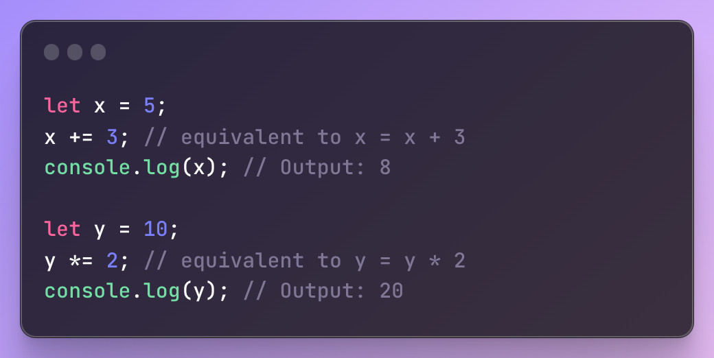 위의 예에서 += 및 *= 연산자는 각각 3을 더하고 2를 곱한 다음 그 결과를 변수 x 및 y에 다시 할당하는 데 사용됩니다.