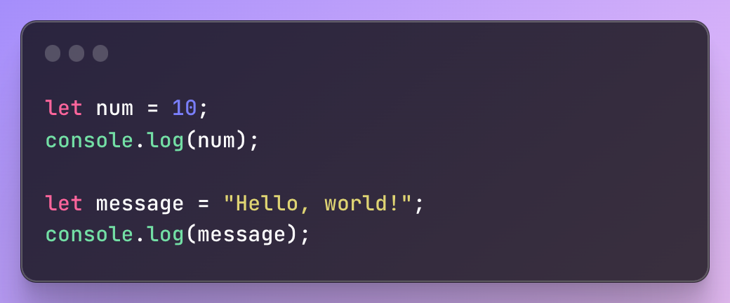 위의 예에서 = 연산자는 값 10을 변수 num에 할당하고 문자열 "Hello, world!"를 변수 message에 할당하는 데 사용됩니다.