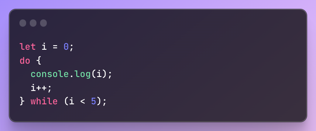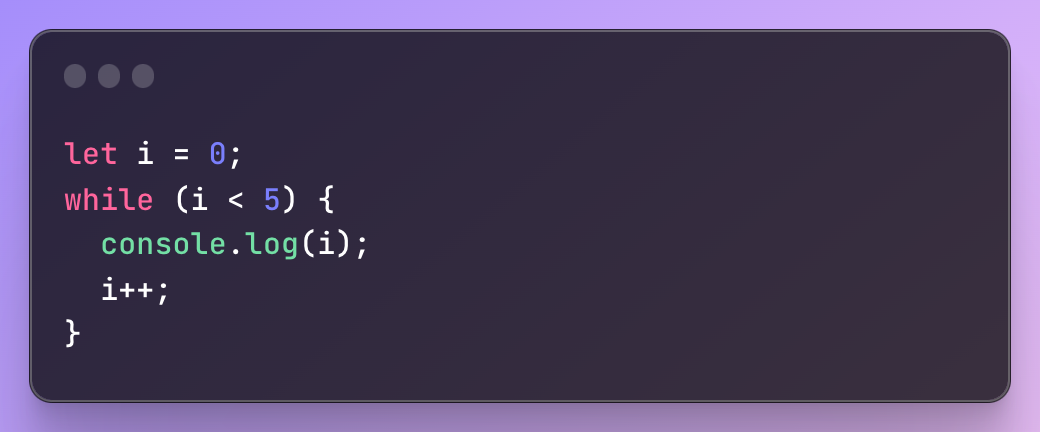 이 예제에서 루프는 0으로 초기화된 변수 i로 시작합니다. 코드 블록은 i가 5보다 작은 동안 실행됩니다. 코드 블록 내에서 i가 콘솔에 출력된 다음 i가 1씩 증가합니다. 루프는 i가 더 이상 5보다 작지 않을 때까지 계속됩니다.