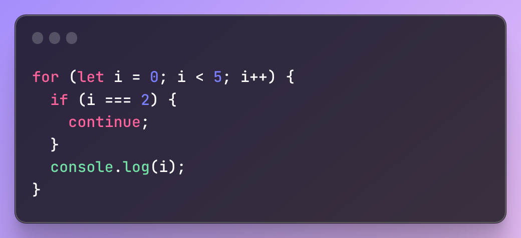 이 예제에서 루프는 '0'에서 '4'까지 반복됩니다. i가 2이면 continue 문이 발생합니다. 결과적으로 'continue' 문 다음의 코드 블록은 건너뛰고 프로그램은 다음 반복으로 진행합니다. 따라서 숫자 2는 콘솔에 인쇄되지 않고 0, 1, 3 및 4가 각각 별도의 줄에 출력됩니다.