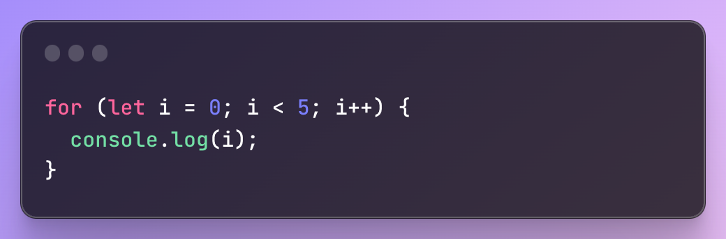 이 예제에서는 코드 블록이 먼저 실행되어 콘솔에 '0'을 출력합니다. 그러면 i의 값이 1씩 증가합니다. 조건 i < 5가 평가되고 true이면 루프가 다음 반복으로 계속됩니다. 조건이 'false'로 평가되면 루프가 중지됩니다.