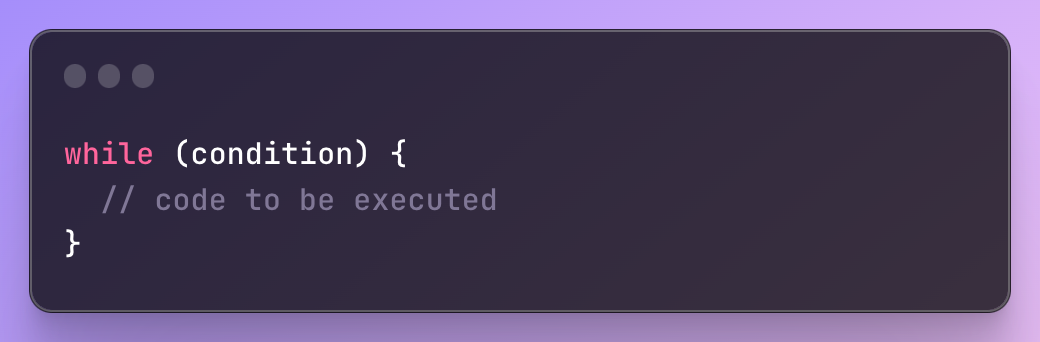 while문은 지정된 조건이 true로 평가되는 한 코드 블록을 실행합니다. while문의 구문은 다음과 같습니다.