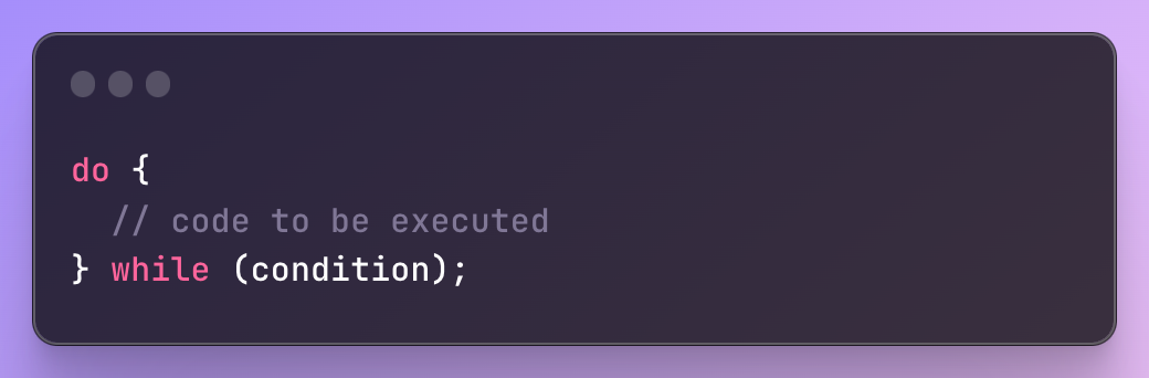 do...while문은 while문과 유사하지만 조건을 확인하기 전에 코드 블록이 한 번 이상 실행되도록 보장합니다. do...while 문의 구문은 다음과 같습니다.