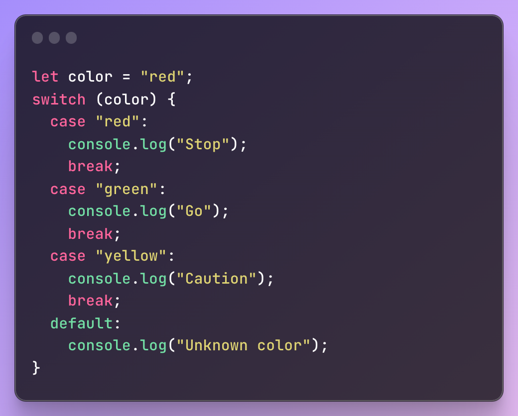 이 예제에서는 switch 문을 사용하여 color 변수의 값을 확인합니다. color가 "red"이면 해당 case 블록이 실행되고 break 문이 발생합니다. 이로 인해 프로그램 제어가 switch 문을 종료하고 다른 경우의 실행을 건너뜁니다. 결과적으로 "Stop"만 콘솔에 인쇄됩니다.