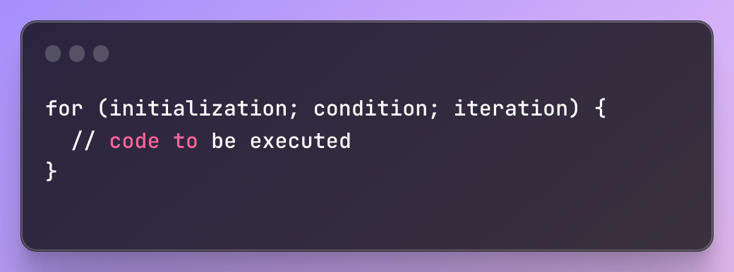for문은 특정 조건에 따라 코드 블록을 반복적으로 실행할 수 있는 루프를 만드는 데 사용됩니다. 초기화, 조건 및 반복을 한 줄로 결합하는 간결한 구문이 있습니다. for문의 일반적인 구조는 다음과 같습니다.