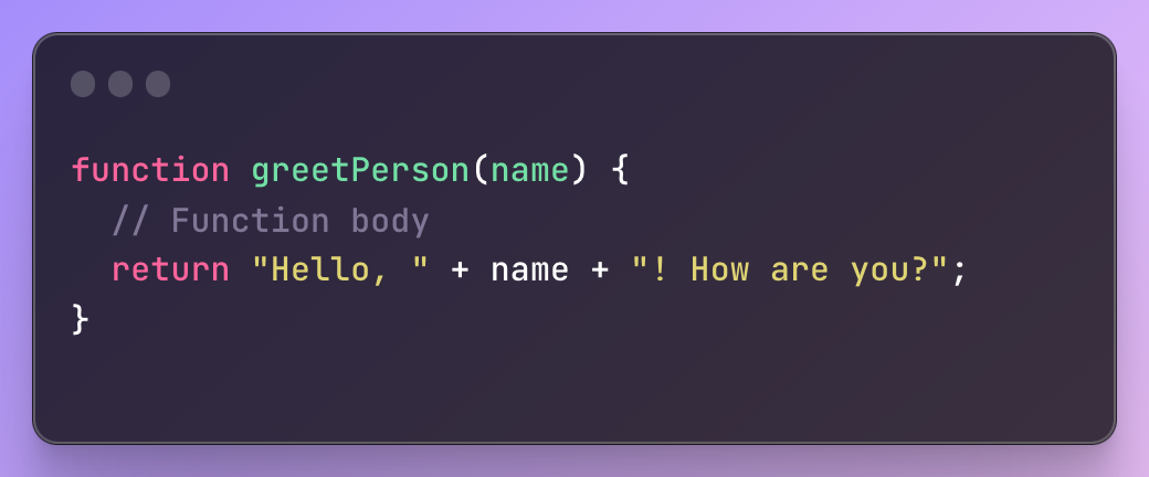 이 소스에서는 사람의 이름을 매개 변수로 사용하고 인사말 메시지를 반환하는 'greetPerson'이라는 함수를 정의합니다.