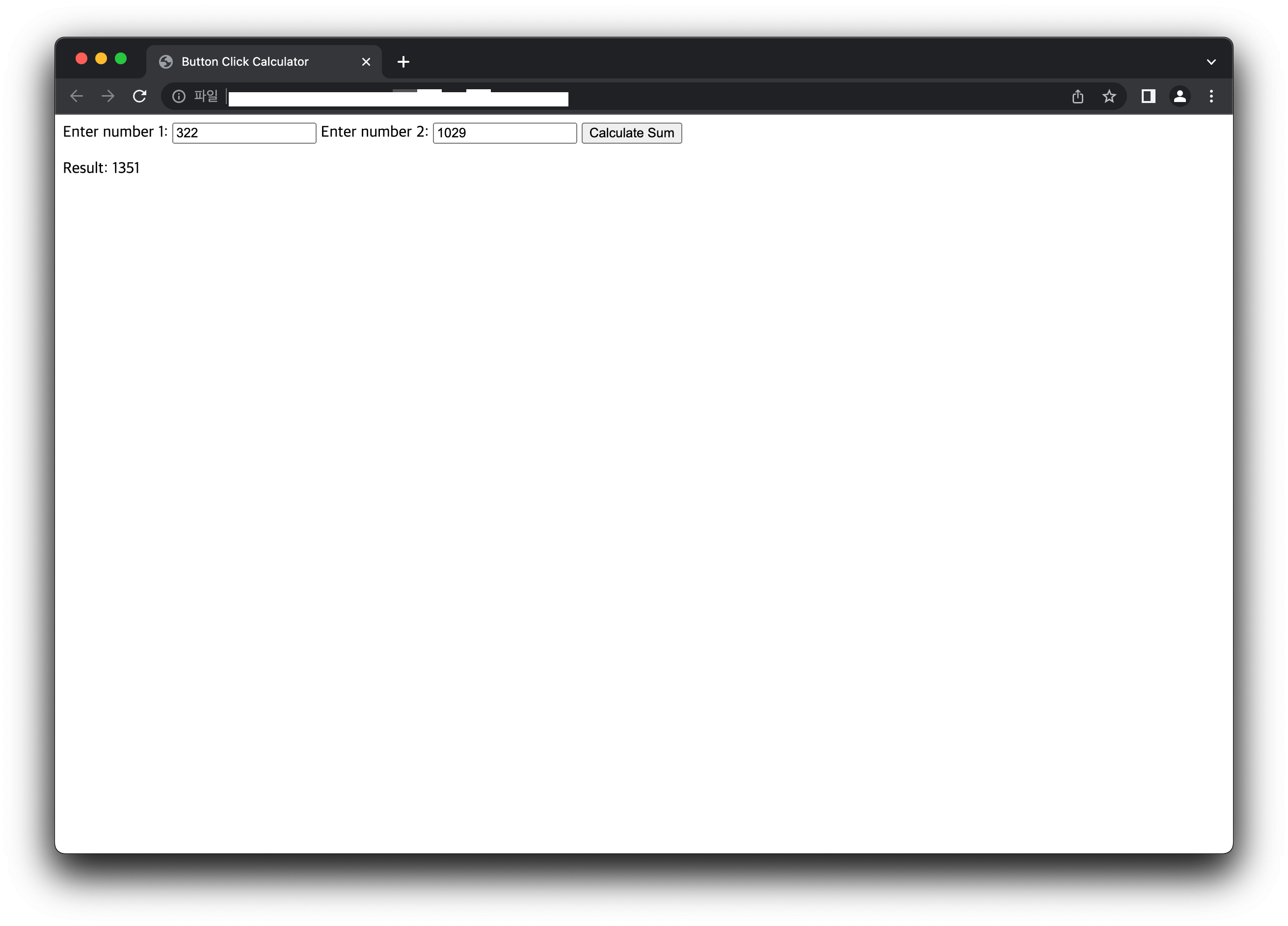 위 이미지처럼 첫 번째로 322라는 숫자를 입력받고 두 번째로 1029라는 숫자를 성공적으로 입력 받고 옆에 있는 Calculate Sum이라는 버튼을 눌렀을 때 자바스크립트 파일에서 caculateSum() 함수가 실행되고 그 결괏값이 아래에 나타납니다. 함수를 선언해두면 이렇게 필요한 곳에서 함수를 실행할 수 있습니다.