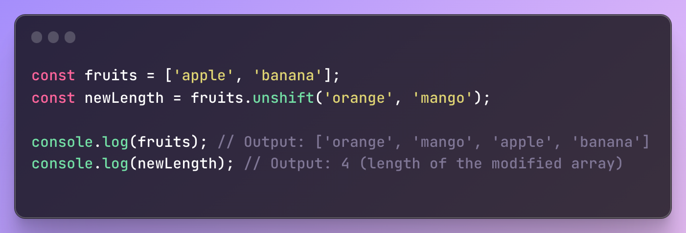 unshift() 함수는 배열의 시작 부분에 즉, 맨 앞에 하나 이상의 요소를 추가하는 데 사용됩니다. unshift()도 마찬가지로 기존 배열에서 새로운 요소를 추가한 후 배열의 새 길이를 반환합니다.