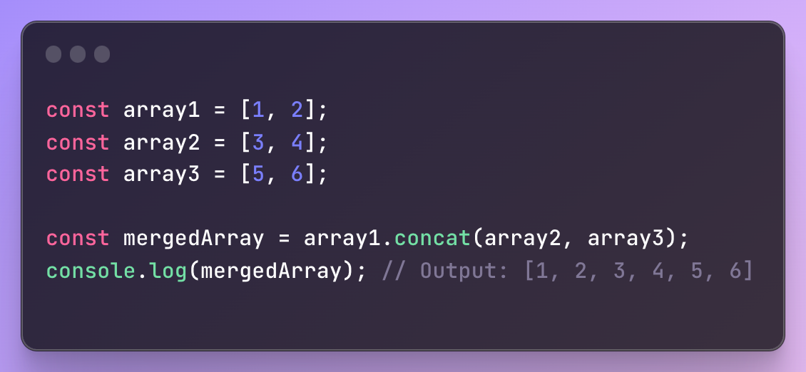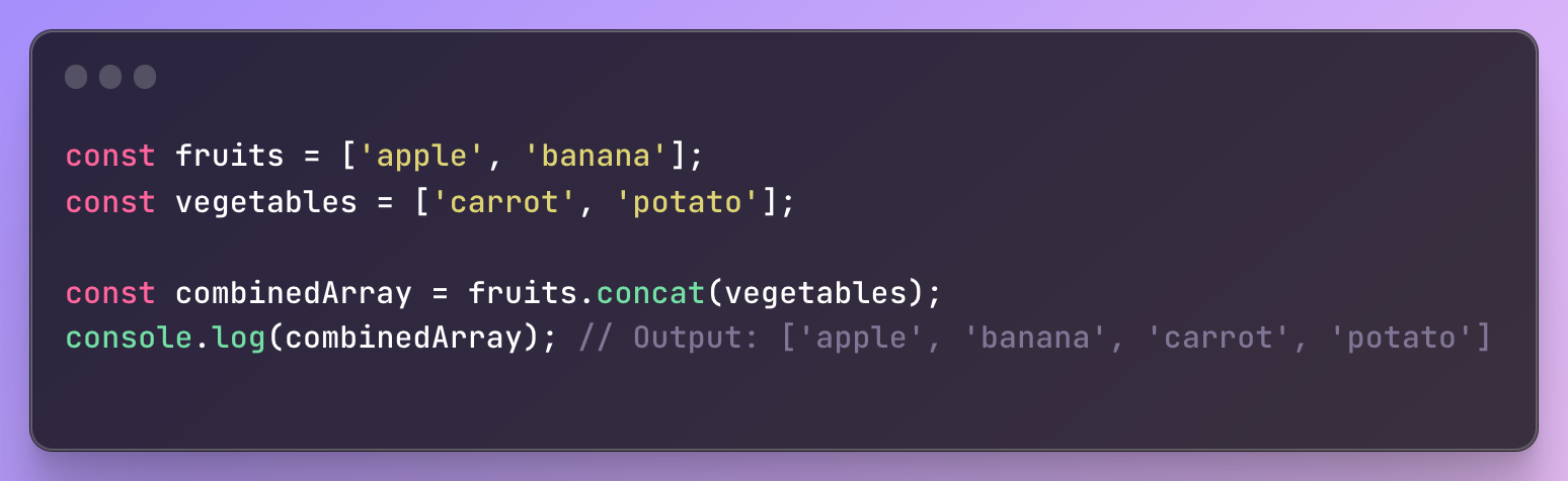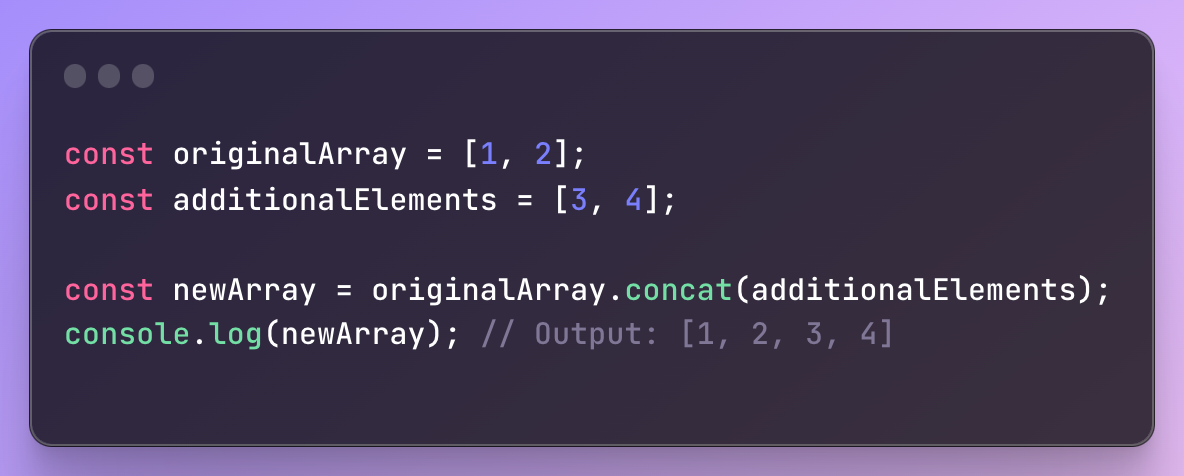 concat() 메서드는 원래 배열을 수정하지 않고 배열을 결합하려는 경우에 편리합니다. 새 배열을 생성하므로 큰 배열을 다루는 경우 다른 배열 조작 방법만큼 효율적이지 않을 수 있습니다. 이러한 경우 push() 또는 스프레드 연산자([...array1, ...array2])와 같은 다른 방법이 더 효과적일 수 있습니다. push() 함수는 밑에서 따로 살펴보겠습니다.