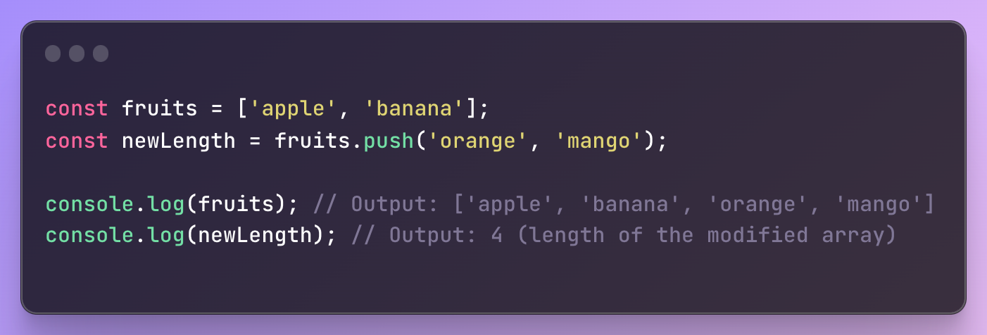 두 방법 모두 요소가 인수로 표시되는 순서대로 추가되고 배열이 직접 수정됩니다. 다른 배열에서 요소를 추가하려면 스프레드 연산자(...)를 사용하여 배열을 연결하거나 대신 concat() 메서드를 사용할 수 있습니다. 또한 배열 중간에 요소를 추가하려는 경우 splice()와 같은 배열 접합 기술을 사용할 수 있습니다.