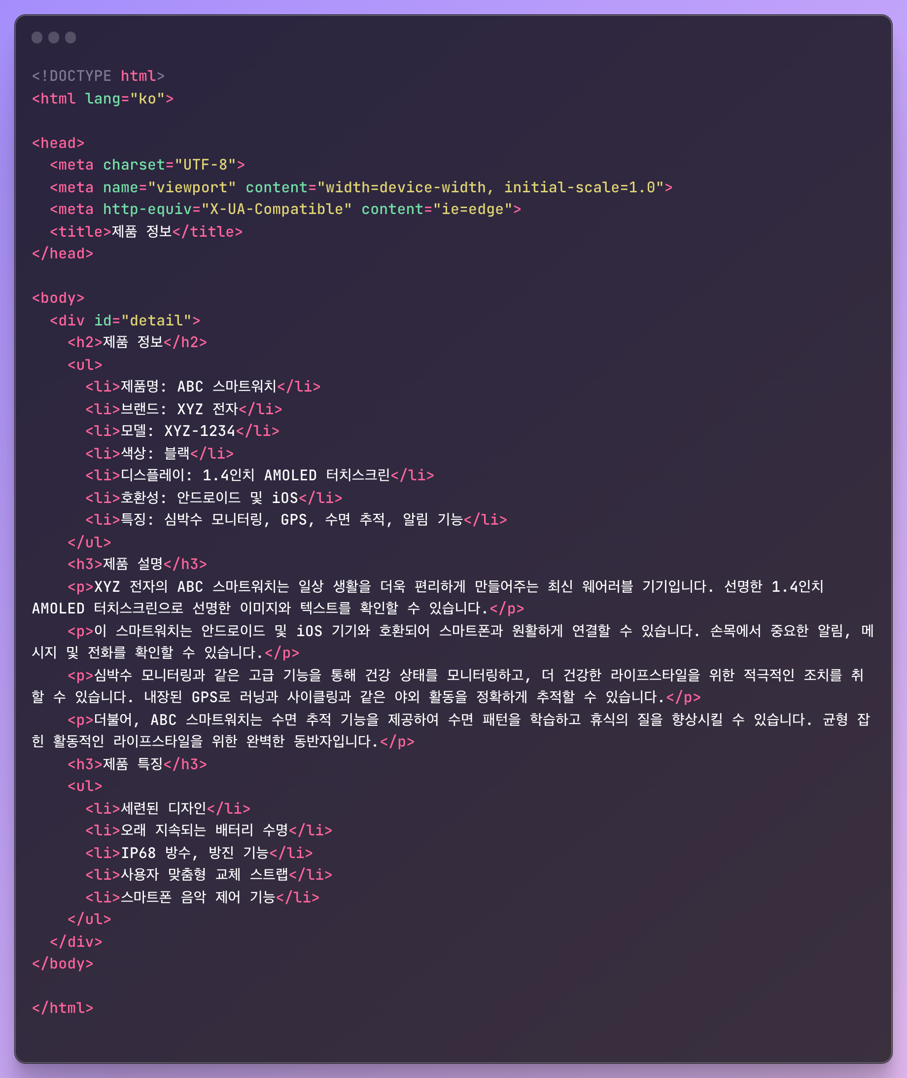 해당 소스는 HTML로 작성한 스마트워치 상품 정보입니다. 여기에서 제품 설명을 보이지 않게 하려면 해당 파일을 열어서 제품 설명이 가려지도록 CSS를 작성하면 됩니다. 하지만 매번 이렇게 작업을 하는 것은 매우 번거롭고 비효율적입니다.