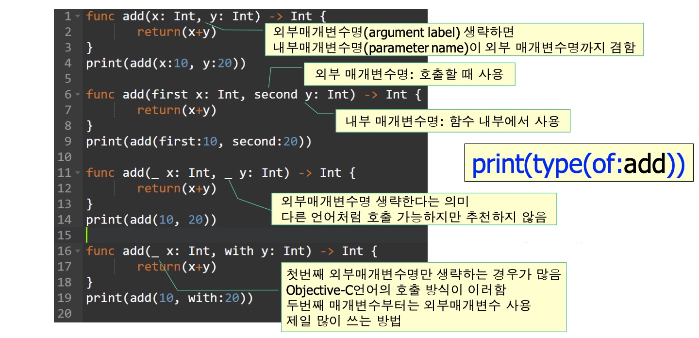 - 외부 매개변수(Argument Label): 함수를 호출할 때 인자를 전달하는 데 사용되는 레이블입니다. 외부 매개변수는 호출자가 어떤 값을 전달해야 하는지 명확하게 표시하기 위해 사용됩니다. 기본적으로 외부 매개변수와 내부 매개변수의 이름은 동일합니다.