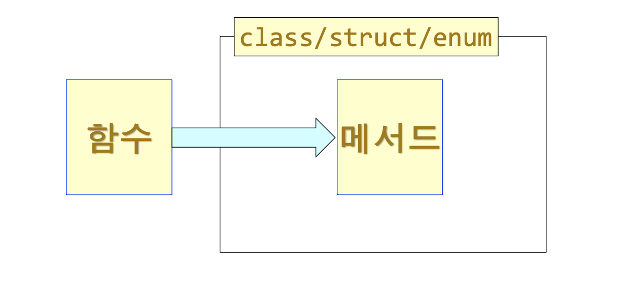 메서드는 특정 클래스, 구조체, 열거형 내의 함수로, 함수를 클래스 내에 선언하면 메서드라고 부릅니다.