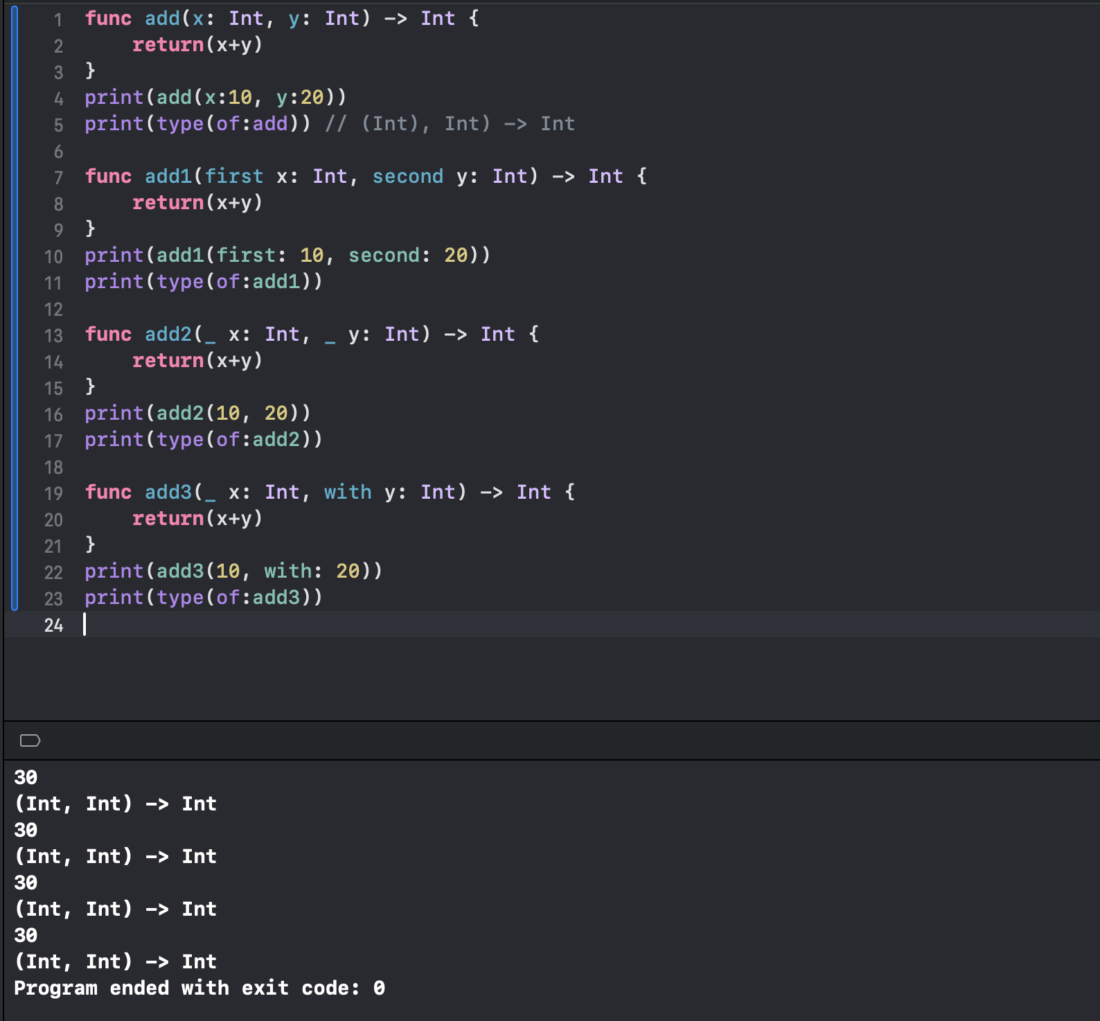 아까 배운 것처럼 이것 역시 print(type(of:add)) 이렇게 출력을 해보면 해당 함수의 자료형이 나오게 됩니다.