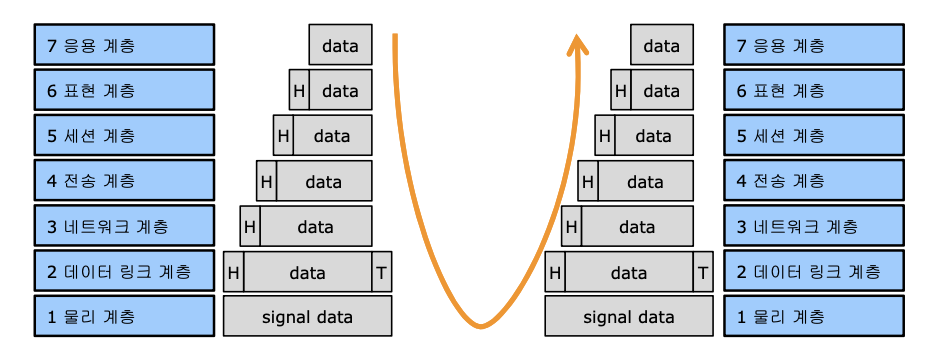 - 최상위 계층(7계층)에서 발생한 데이터를 하위 계층으로 차례로 전달